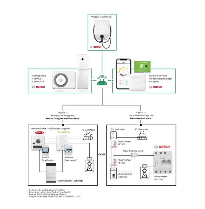 Voraussetzung für den Energiemanager im Bosch Smart Home ist eine Wärmepumpe und eine Photovoltaik Anlage mit einem Fronius Symo Wechselrichter oder einem Sungrow Wechselrichter oder einem Bosch Power Meter, die beide mit dem Internet-Router verbunden sind.
